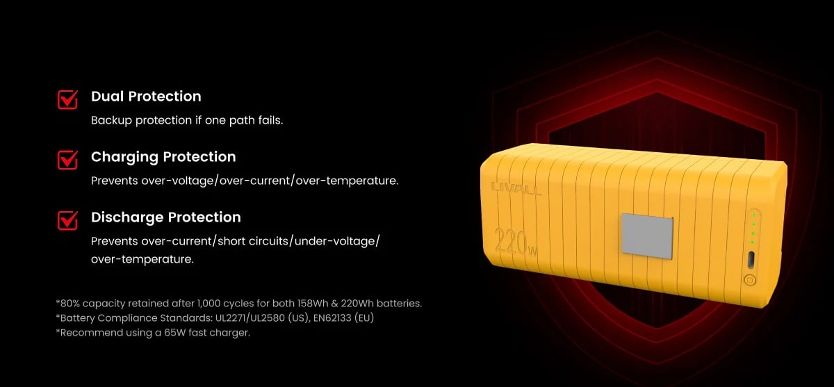 The lithium-ion battery is built for durability and long-lasting performance. The integrated Battery Management System (BMS) provides multiple protections to keep the battery healthy, retaining 80% capacity after 1,000 cycles.